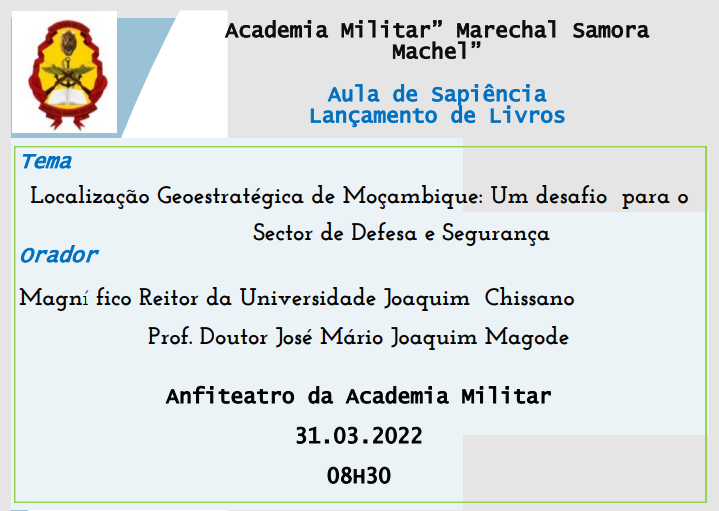 Tema Localização Geoestratégica de Moçambique: Um desafio para o Sector de Defesa e Segurança Orador Magnífico Reitor da Universidade Joaquim Chissano Prof. Doutor José Mário Joaquim Magode Anfiteatro da Academia Militar 31.03.2022 08H30 Clique aqui para baixar o Edital