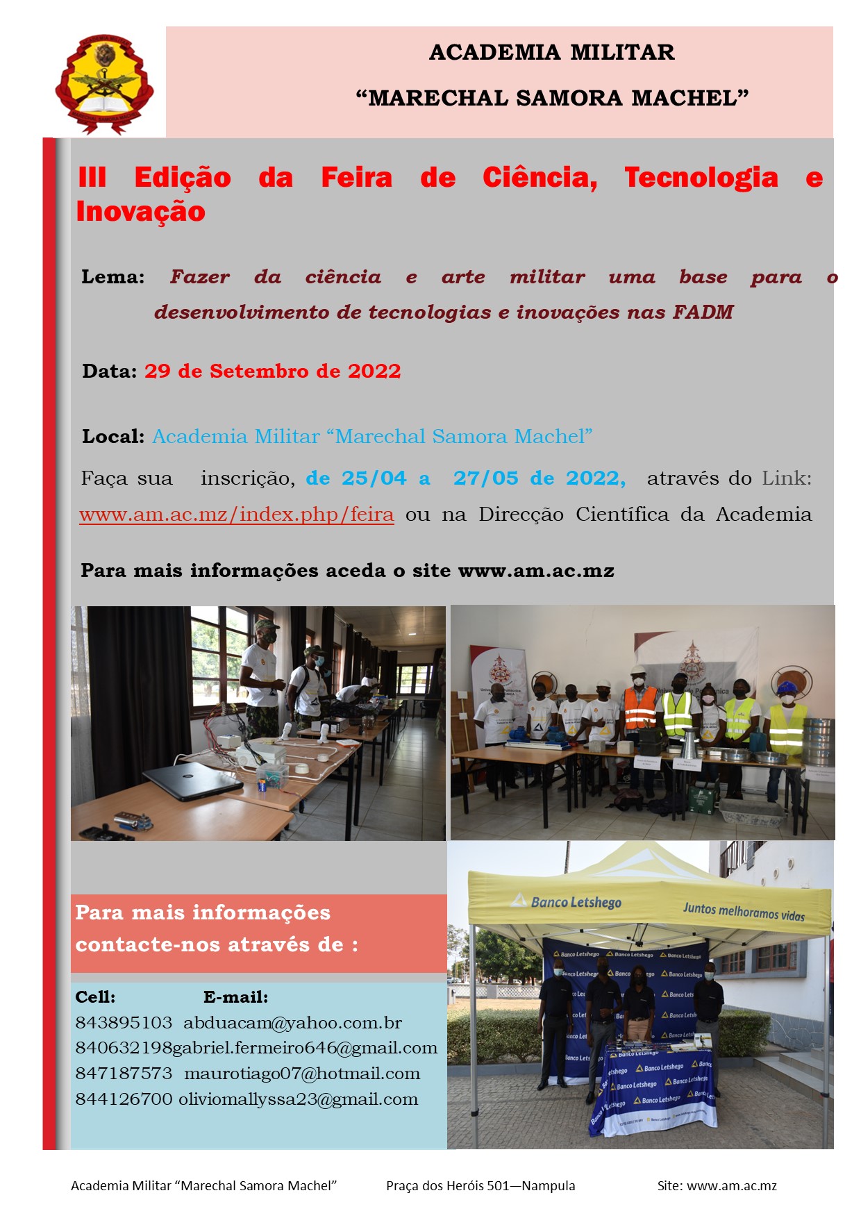 A data acordada para realização do evento é 29.09.2022, sob o lema: “Fazer da ciência e arte militar uma base para o desenvolvimento de tecnologias e inovações nas FADM”. BAIXA AQUI O EDITAL DA III EDIÇÃO DA FEIRA DE CIÊNCIAS, TECNOLOGIA E INOVAÇÃO Objectivos • Estimular o espirito de invenção, inovação, desenvolvimento de projectos técnico-científicos e tecnológicos, como soluções práticas…