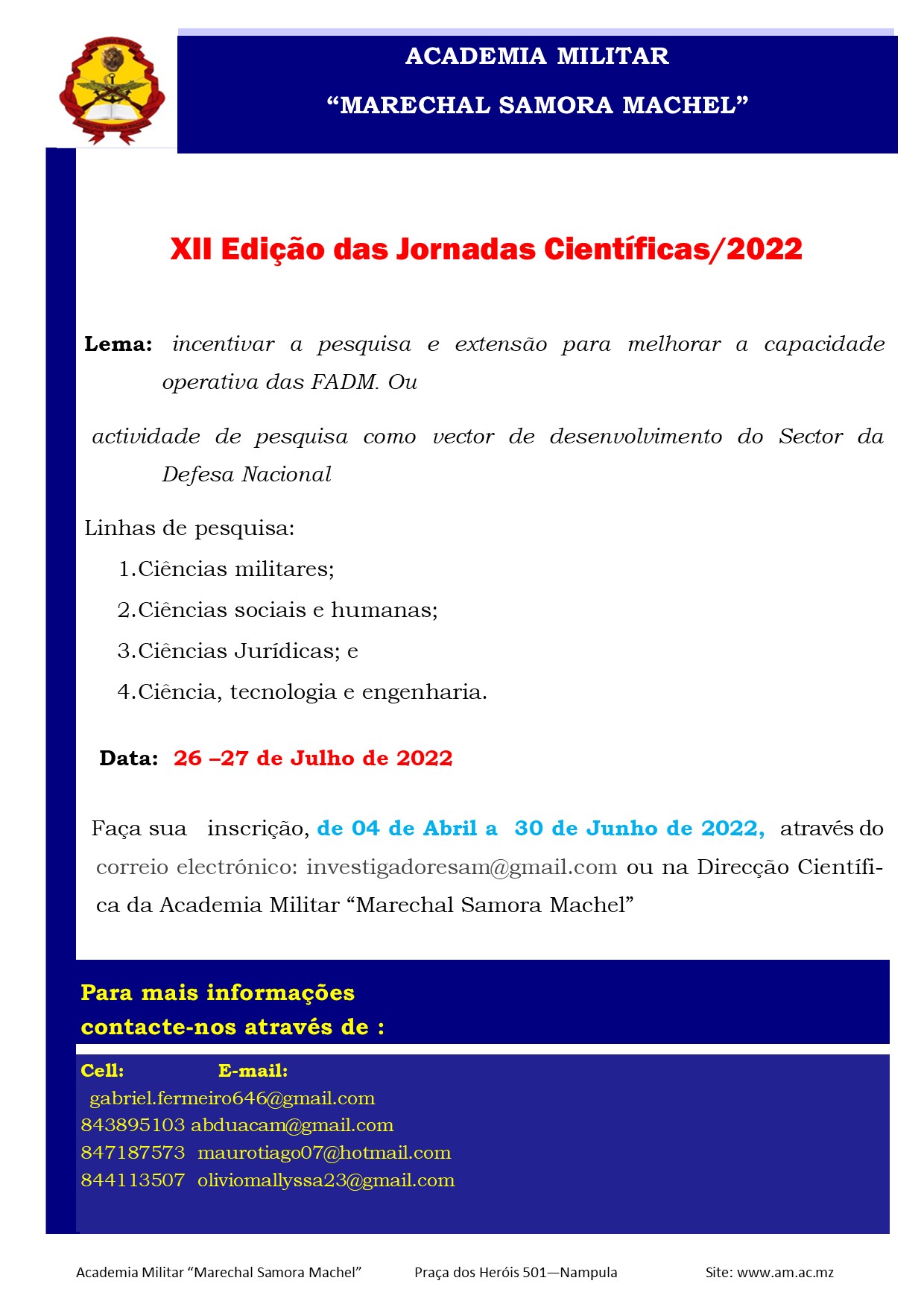 O Departamento de Cursos Pós-laboral da Academia Militar, vem através deste comunicar a prorrogação das inscrições aos Cursos de Mestrado e Licenciatura até 10 de Fevereiro de 2022. Cordiais Saudações Clique aqui para baixar o documento oficial
